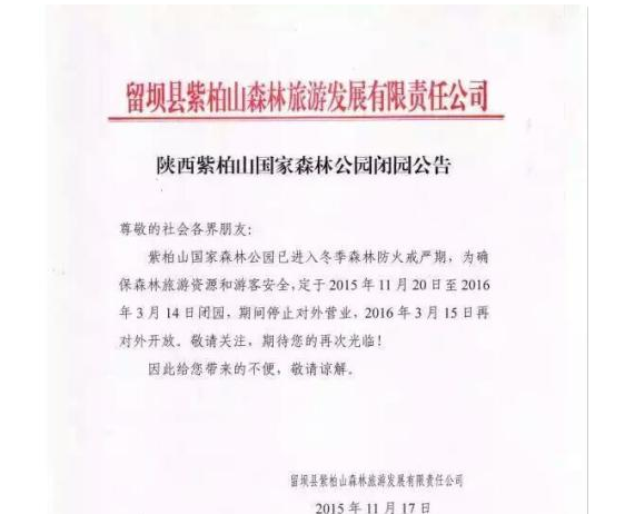 随着冬季的来临,留坝县紫柏山国家森林公园已进入冬季森林防火戒严期。据悉,为确保森林旅游资源和游客安全,将于2015年11月20日至2016年3月14日闭园,期间停止对外营业,2016年3月15日再对外开放。