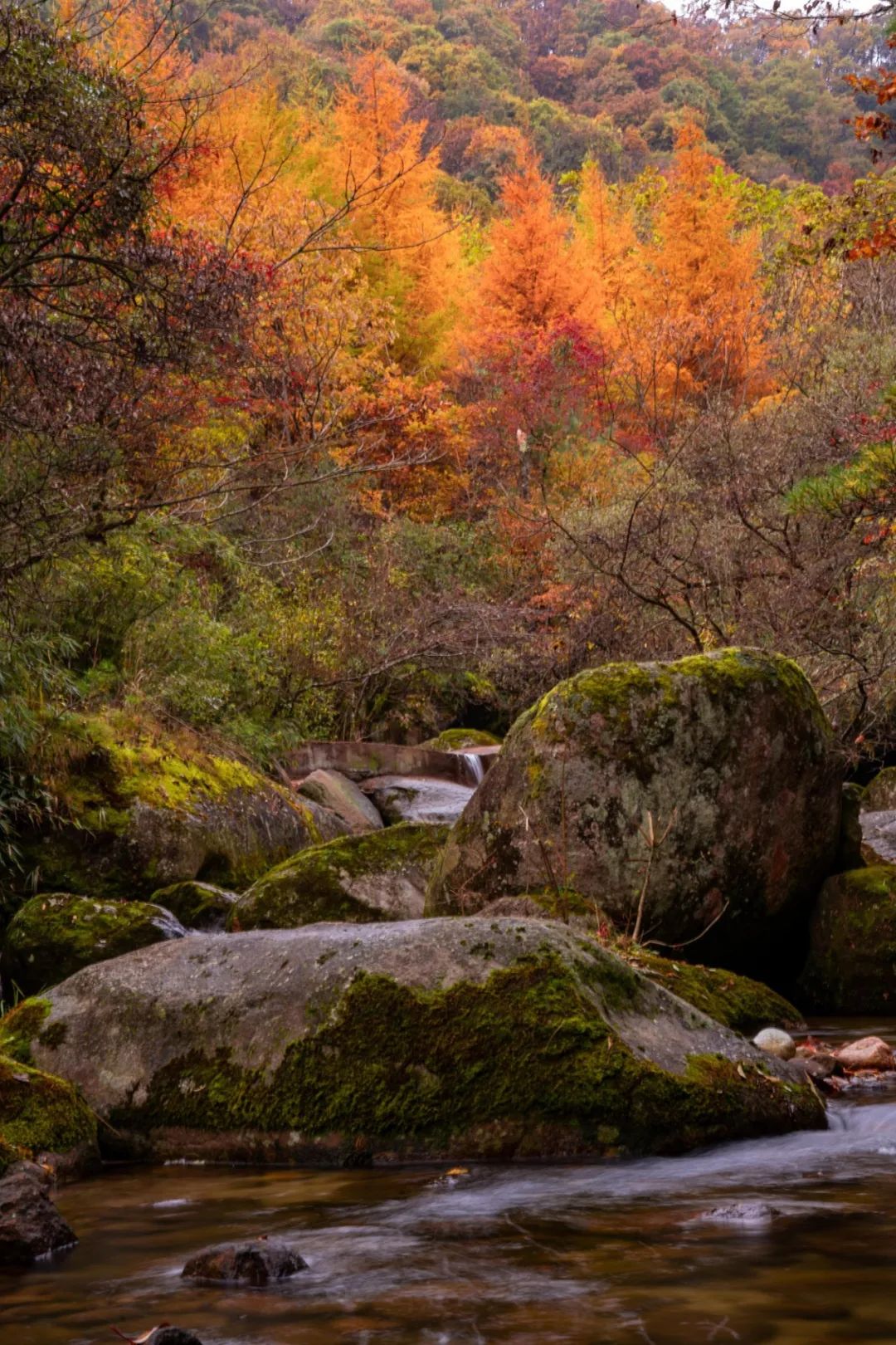 如今松树坝林海涛涛、山道悠悠,雷公潭小溪潺潺、瀑布成群、巨石错落、秋意阑珊。这里是五处红叶秘境中以红叶与水景见长的所在。