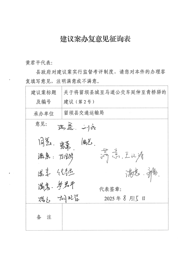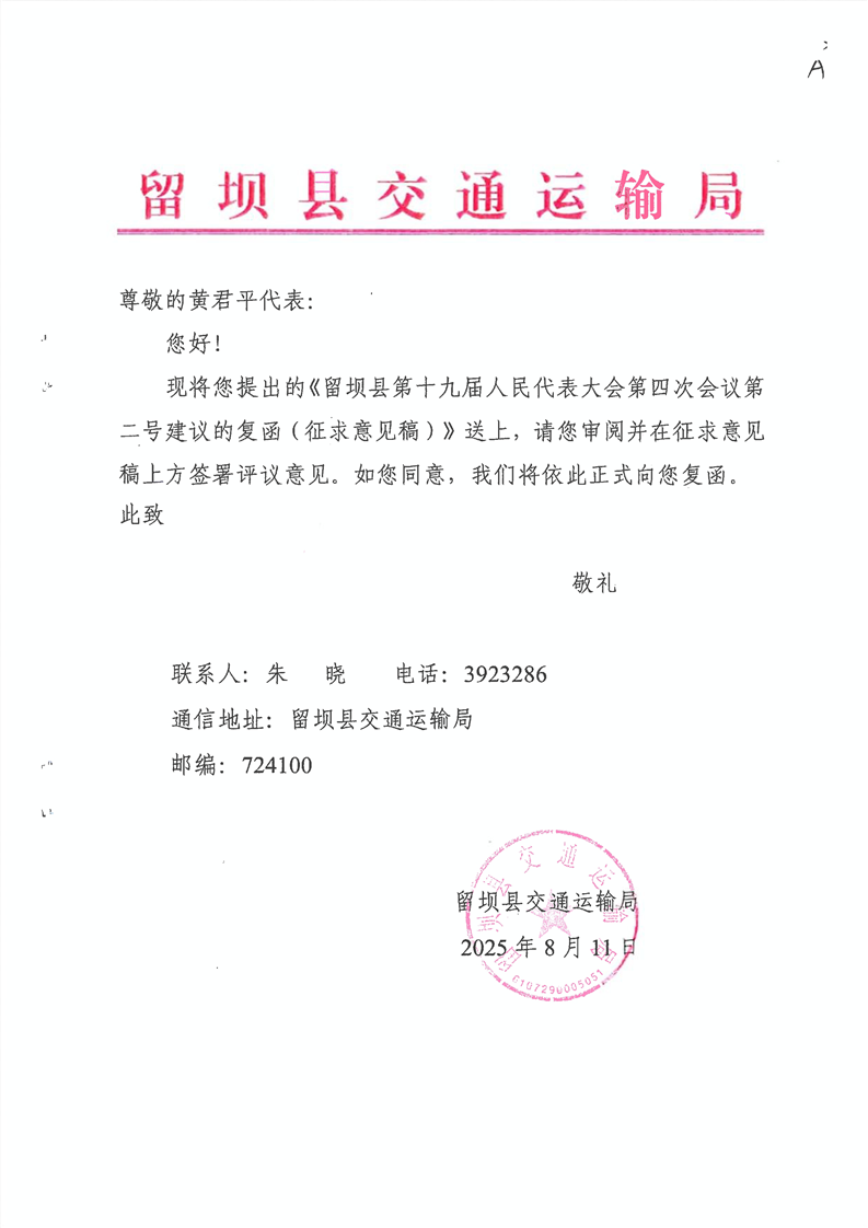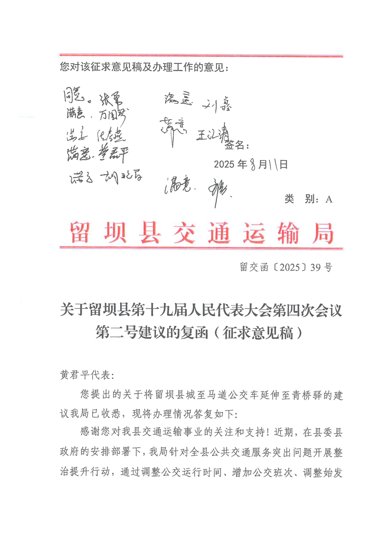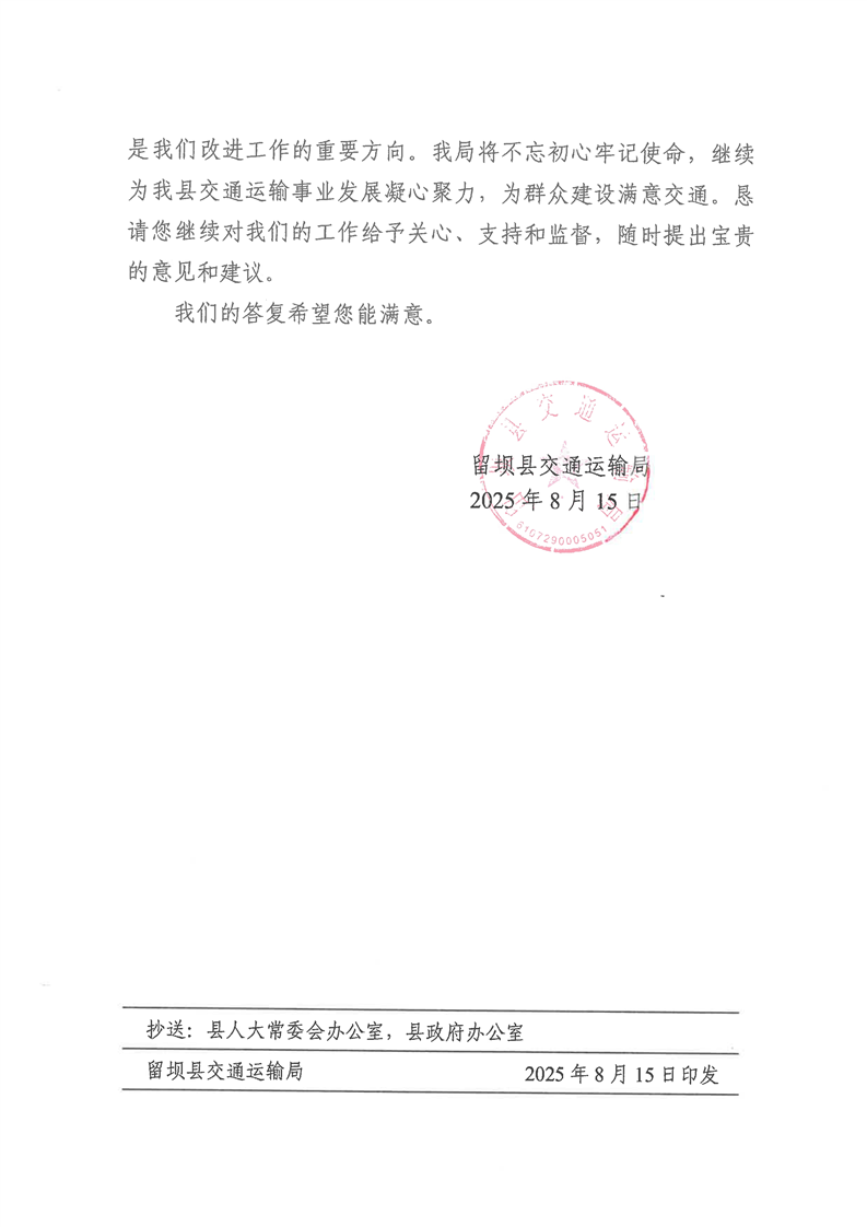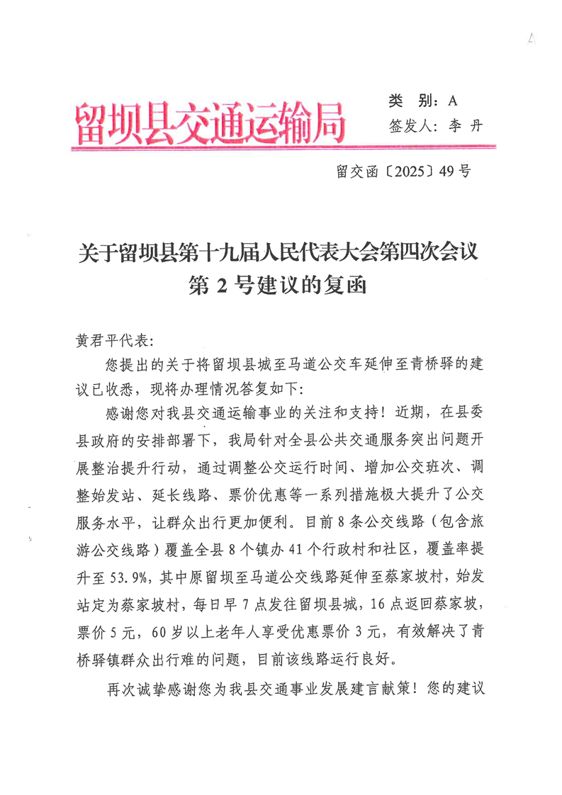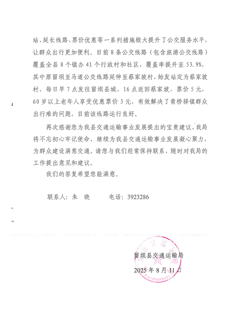 关于将留坝县城至马道公交车延伸至青桥驿的建议的复函