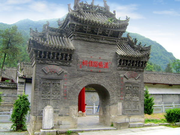 张良殿:是现存建筑中年代最早最完整的歇山式建筑,面阔三间,九檩九椽,檐下镂空木雕,殿内八卦藻井,内有张良镀金塑像一尊,两侧各立一书僮,雕刻手法细腻,栩栩如生。