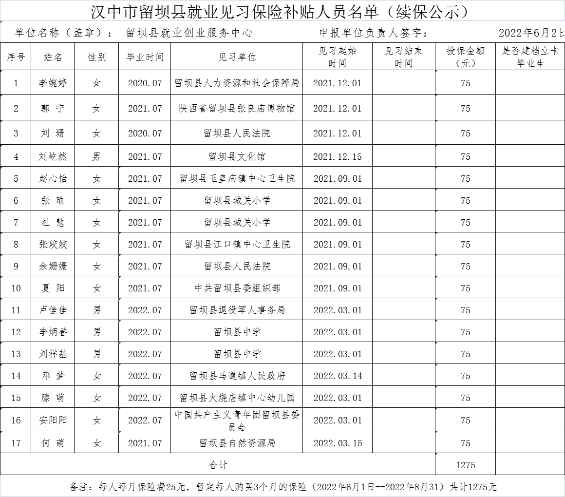 汉中市留坝县就业见习保险补贴人员名单(续保公示)
