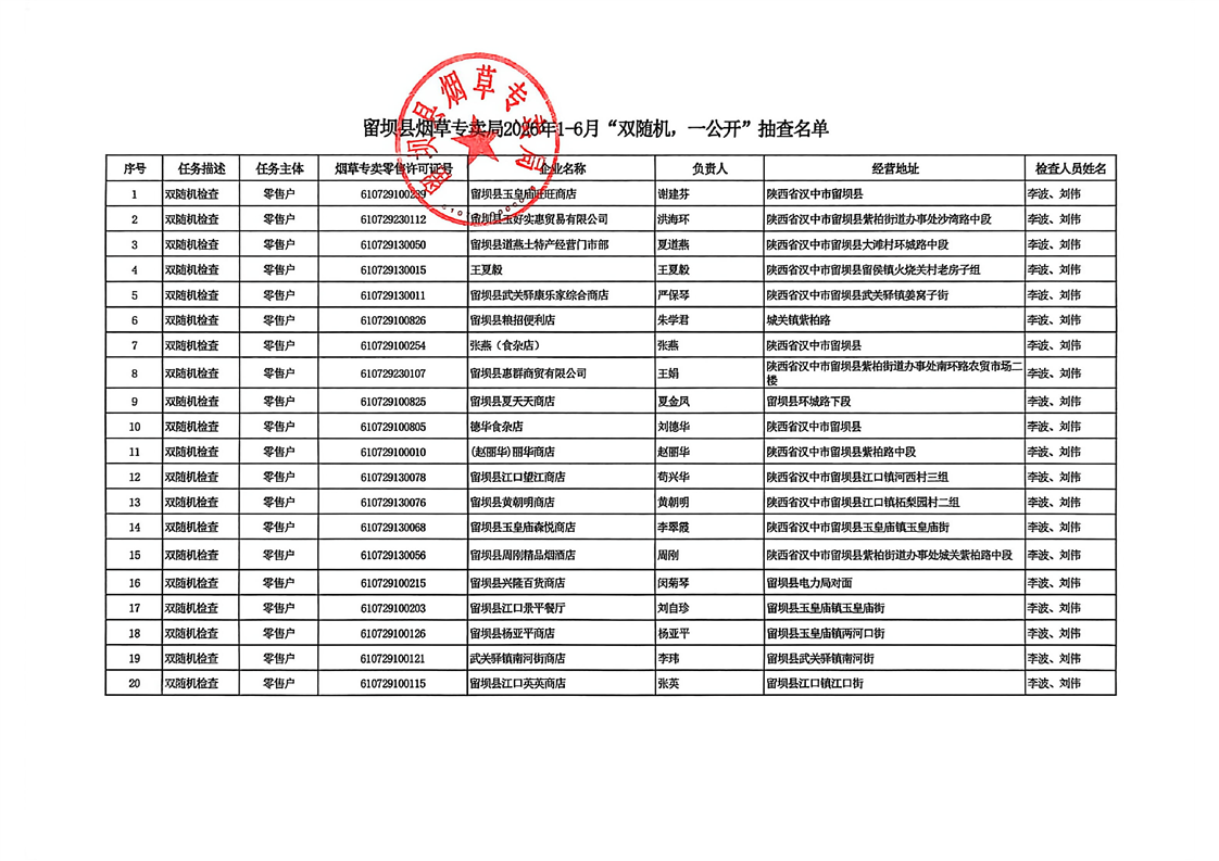 留坝县烟草专卖局2026年1-6月“双随机,一公开”抽查名单